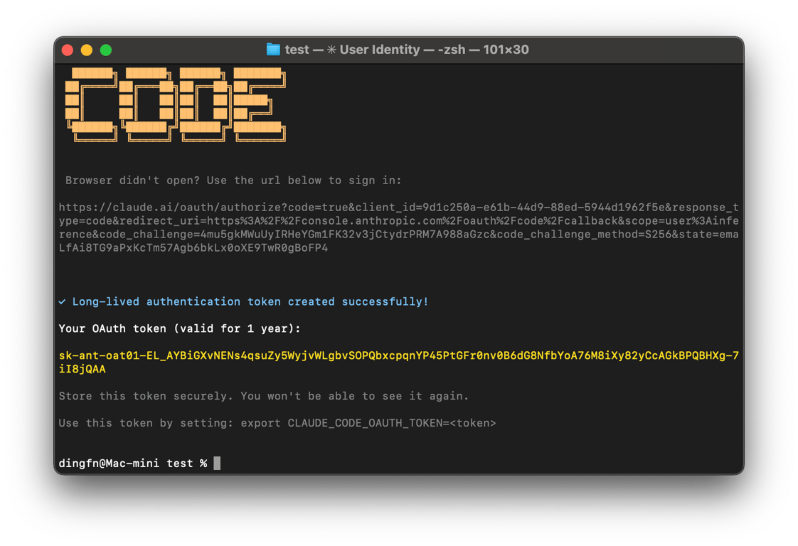 Use this token by setting: export CLAUDE_CODE_OAUTH_TOKEN=<token>