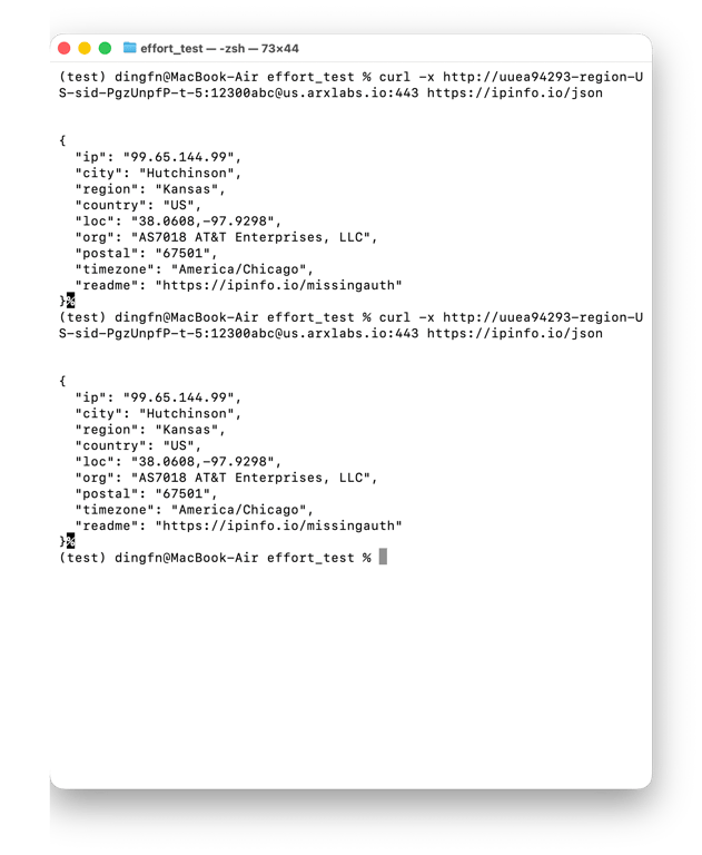 curl -x http://uuea94293-region-US-sid-PgzUnpfP-t-5:12300abc@us.arxlabs.io:443 https://ipinfo.io/json